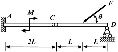 图示多跨梁由AC和CD铰接而成,自重不计。已知:F=1kN,M=2kN·m,L=1m,θ=45°。则支座D的约束力为( )。