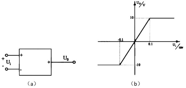 图(a)所示运算放大器的传输特性如图(b)所示,如果希望U0=10^5Ui,输入信号Ui应为( )。