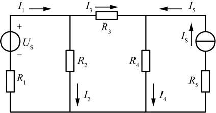 在图示电路中,各电阻元件参数及US,IS均已知,方程(1)I1-I2-I3=0,(2)I3-I4+I5=0,(3)R2I