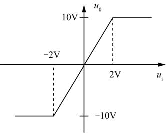 某模拟信号放大器输入与输出之间的关系如图所示,如果信号放大器的输出u0=10V,那么,此时的输入值一定( )。