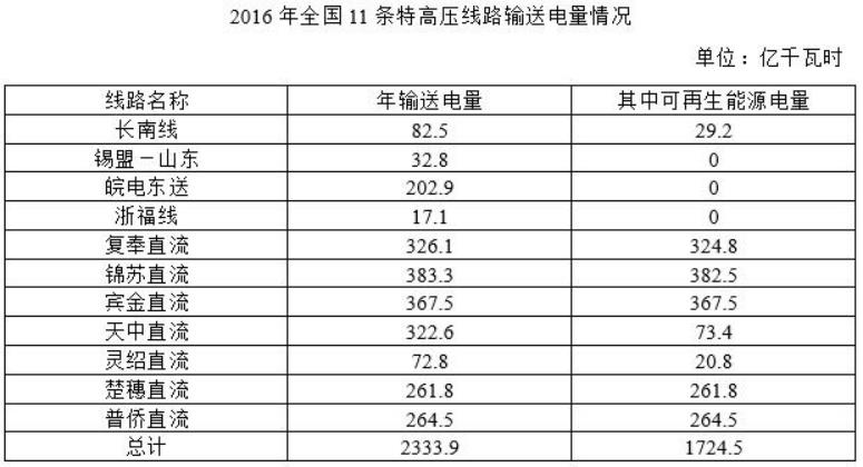 表中2016年输送电量排名前三的特高压线路,不可再生能源输送电量在以下哪个范围内?
