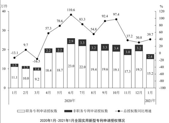2020年2月—2021年1月,全国实用新型专利申请授权中,职务专利申请授权数环比增量高于同期非职务专利申请授权数环比增