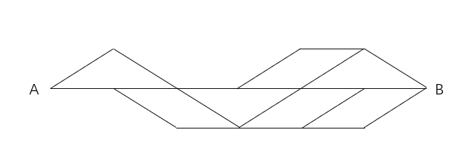 A.B两地之间的道路如下图实线所示。张某从A地前往B地,且途中只能向正东,东北或者东南方向行进,问有多少种不同的行进路线