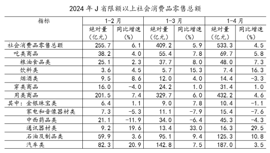 表中所列6类用类商品中,2024年3月J省限额以上零售总额同比增速超过同年1—3月水平的有几类?( )