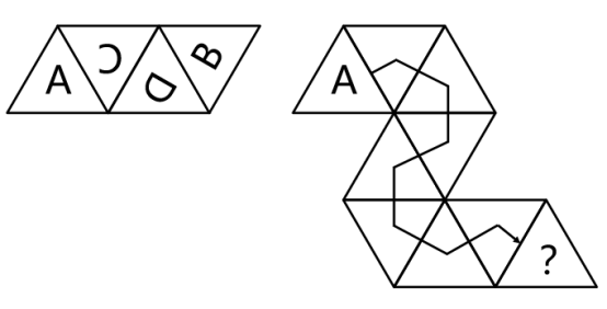 左图为给定正四面体的外表面展开图,将其折叠为正四面体后,把A面向下放在与右图完全一致的位置,然后沿箭头所示路径翻转正四面体到达问号处,问此时底面的字母为( )。