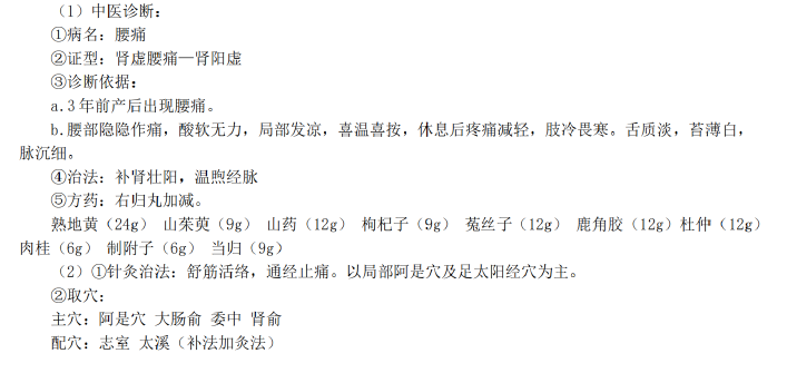 案例题 (分析题)【中医临床的试题】 患者,女,30岁。3年前产后出现腰痛,并反复发作。3天前腰痛又发。就诊时腰部隐隐作