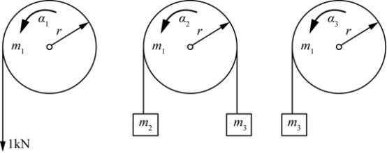 质量m1与半径r均相同的三个均质滑轮,在绳端作用有力或挂有重物,如图所示。已知均质滑轮的质量为m1=2kN·s^2/m,重物的质量分别为m2=0.2kN·s^2/m,m3=0.1kN·s^2/m,重力加速度按g=10m/s^2计算,则各轮转动的角加速度α间的关系是( )。