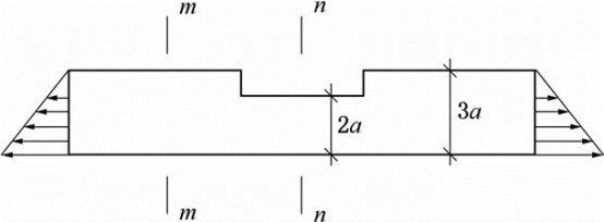 矩形截面杆的截面宽度沿杆长不变,杆的中段高度为2a,左、右段高度为3a,在图示三角形分布荷载作用下,杆的截面m—m和截面