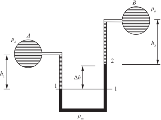设A、B两处液体的密度分别为ρA与ρB,由U型管连接,如图所示,已知水银密度为ρm,1、2面的高度差为Δh,它们与A、B