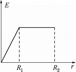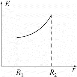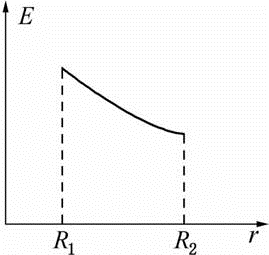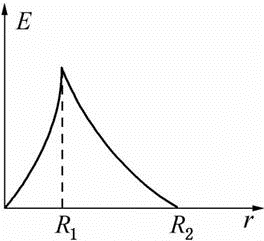 同心球形电容器,两极的半径分别为R1和R2(R2>R1),中间充满相对介电系数为εr的均匀介质,则两极间场强的分布曲线为