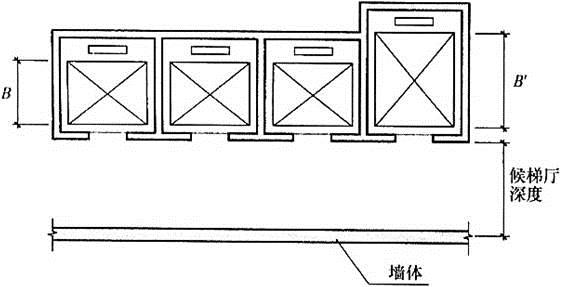 下图中,公共建筑多台单侧排列电梯候梯厅的最小深度应为( )。(注:B为轿厢深度,B′为电梯群中最大轿厢深度)
