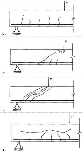单选题 图示混凝土梁的斜截面破坏形态,属于斜压破坏的是( )。