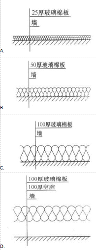 单选题 由相同密度的玻璃棉构成的下面4种吸声构造中,哪种构造对125Hz的声音吸收最大?( )