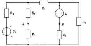 电路如图所示,已知:R1=6Ω,R2=R3=3Ω,R4=2Ω,R5=8Ω,R6=10Ω,Us=18V,Is=3A,则A、