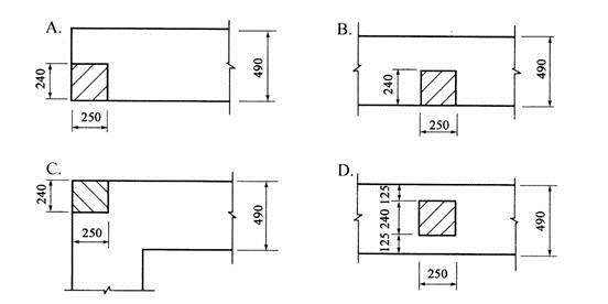尺寸为240mm×250mm的局部受压面,支承在490mm厚的砌墙采用MU10烧法多孔砖、M5混合砂浆砌筑,可能最先发生局部受压破坏的是下列何图所示的砌墙?( )