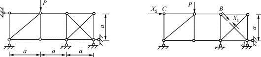 如图a所示桁架,EA为常数,取图b为力法基本体系,则力法方程系数间的关系为( )。