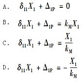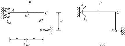 单选题 图所示中,用力法解图(a)所示结构(图中kM为弹性铰支座A的转动刚度系数),取图(b)所示的力法基本体系,力法典型方程为( )。