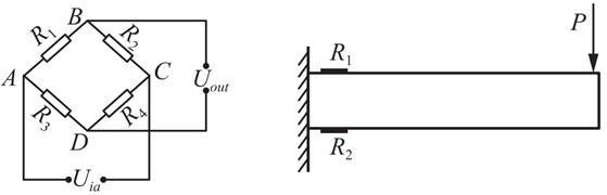 利用电阻应变原理实测钢梁受到弯曲荷载作用下的弯曲应变,如图所示的测点布置和桥臂联接方式,试问电桥的测试值是实际值的多少倍