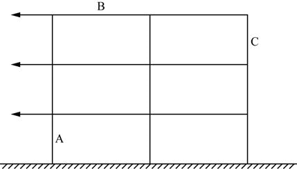 下图所示的规则框架结构中,所有柱参数均相同,所有梁参数也相同,柱线刚度为梁线刚度的3倍,请根据规则框架的简化计算方法指出下列四个选项中针对图中A、B、C杆件的拉压杆判断哪个是正确的?( )