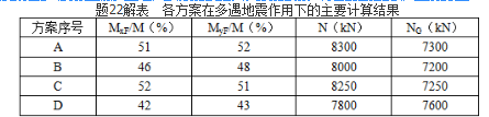 某拟建12层办公楼采用钢支撑-混凝土框架结构,房屋高度为43.3m,框架柱截面700mm×700mm,混凝土强度等级为C50。抗震设防烈度为7度,丙类建筑,II类场地。进行方案比较时,有四种支撑布置方案,假定,多遇地震作用下起控制作用的主要计算结果见题22解表。