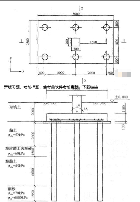 不定项选择题 有一六桩承台基础,采用先张法预应力混凝土管桩,外径500mm,壁厚100mm,C80混凝土,无桩尖。有关地基各土层、桩端土极限端阻力标准值qpk、桩侧土极限摩阻力标准值qsik及桩布置、承台尺寸如图所示。假定,荷载效应的基本组合由永久荷载控制,承台及其上土的平均重度取22kN/m3。