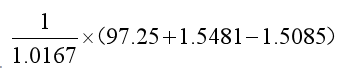 不定项选择题 TF1509合约的市场原价为97.525,对应的最便宜课交割国债价格(全价)为99.640,转换因子为1.0167,至TF1509合约交割日,该国债资金占用成本为1.5481,应计利息为1.5085,则TF1509的理论价格为( )