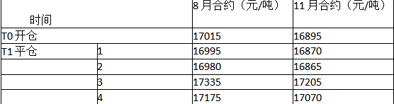 某套利者打算利用沪锌期货进行套利,T0时刻开仓买入8月合约同事卖出11月合约,T1时刻进行平仓,价格如表所示。则该套利盈利的情形有( )