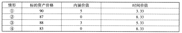 2015年10月18日,CME交易的DEC12执行价格为85美元/桶的原油期货期权,看涨期权权利金为8.33美元/桶,下列关于标的资产价格和时间价值数值的对应中,正确的是()。