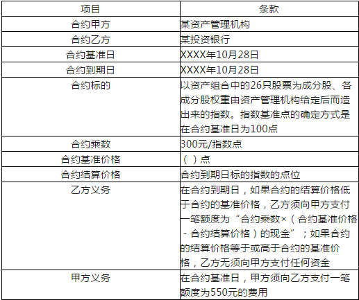 不定项选择题 11月份,某资产管理机构持有共26只蓝筹股票,总市值1.2亿元,当期资产组合相对初始净值已经达到了1.3。为了避免资产组合净值在年底前出现过度下滑,影响年终考核业绩,资产组合管理人需要将资产组合的最低净值基本锁定在1.25水平。为了实现既定的风险管理目标,该资产组合管理人向一家投资银行咨询相应的产品。投资银行为其设计了一款场外期权产品,主要条款如下表所示: