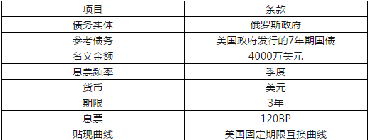 不定项选择题 俄罗斯政府发行的国债,该国债尚有3年剩余期限。该投资机构担心俄罗斯政府由于国内经济衰退而无法筹集足够的资金来还债并违约,所以希望在国际市场上购买CDS来规避信用风险。美国的一家投资银行为其提供了一份CDS合约,合约的条款如下图所示,根据基本条款的内容,回答以下问题。