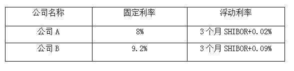 不定项选择题 假设A和B两家公司都希望借入期限为5年的1亿美元,各自的利率如下表所示。B公司想按固定利率借款,而A公司想按3个月期SHIBOR(上海银行间同业拆借利率)的浮动利率借款。