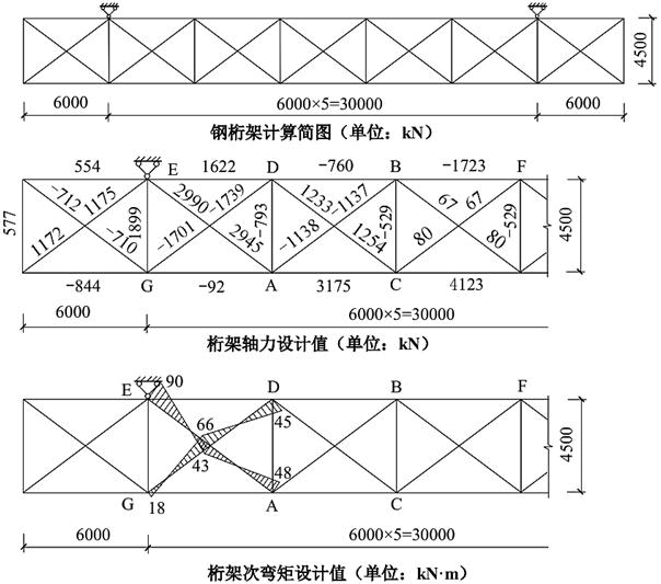 只承受节点荷载的某钢桁架,跨度30m,两端各悬挑6m,桁架高度4.5m,钢材采用Q345,其杄件截面均采用H形,结构重要