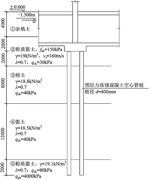 7度抗震设防区某建筑工程,上部结构采用框架结构,设一层地下室,采用预应力混凝土空心管桩基础,承台下普遍布桩3~5根,桩型为AB型,桩径400mm,壁厚95mm,无柱尖,桩基环境类别为三类,场地地下潜水水位标高为-0.500m~-1.500m,③粉土中承压水水位标高为-5.000m。局部基础面及场地上分层情况如题图所示。