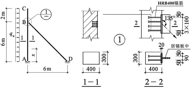 不定项选择题 某建筑屋顶构架在风荷载作用下的计算简图、构件AC截面、构件AC与构件BD的连接大样如题8~10图所示,构件安全等级均为二级。假定,该构件可能分别承受大小相等、方向相反的左风或右风作用。构件AC为等截面钢筋混凝土构件,混凝土C30,钢筋HRB400,as=as′=40mm;构件BD为钢构件,在节点B通过预埋件和连接板与构件AC接连接,构件BD的形心通过锚板中心,构件BD满足强度和稳定要求。作用于构件AC上的风荷载设计值为qw;除风荷载外,其他作用的效应忽略不计。