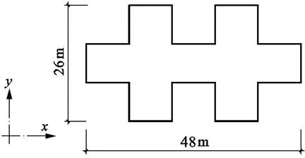 不定项选择题 某52层剪力墙住宅(无框支),周边地形平坦,抗震设防烈度6度,房屋高度150m,各层平面均为双十字形平面,如题图所示。y向风荷载体型系数取1.4,质量沿高度分布均匀,50年一遇风压w0=0.8kN/m2,10年一遇风压w0=0.5kN/m2,地面粗糙度类别为B类。