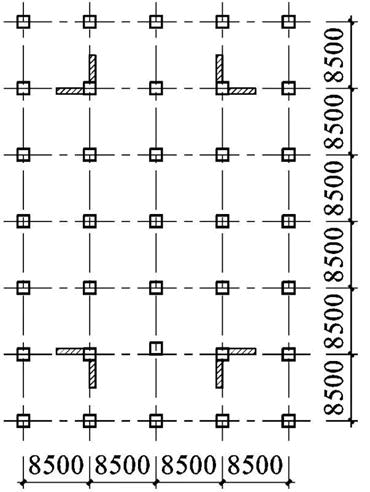 不定项选择题 某6层钢筋混凝土办公楼,丙类建筑,采用框架-剪力墙结构,规定水平力作用下底层框架部分承受的地震倾覆力矩占为总倾覆力矩的40%。首层、三层竖向构件平面图及结构剖面图如题图所示,各层层高均为4.5m,结构高度27m,抗震设防烈度为7度(0.15g),设计地震分组为第一组,建筑场地类别为Ⅱ类,安全等级为二级。