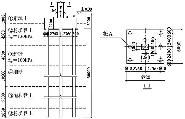 不定项选择题 某安全等级为乙级的办公楼,框架柱截面尺寸为1250mm×1000m,承台下共设置8根PHC桩;PHC桩外径600mm,壁厚110mm,敞口桩尖,桩长30m,摩擦型桩;基础及其以上土的加权平均重度为20kN/m3,地下水位标高为-4.0m,不考虑地震作用。基础平面、剖面及部分土层参数如题图所示。