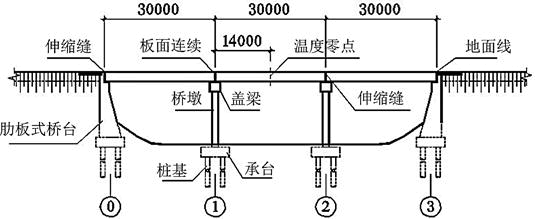 已知,桥台顶面的抗推刚度可取无穷大,1^#、2^#中墩盖梁顶面处的纵桥向抗推刚度分别为k1=35000kN/m、k2=21000kN/m,一块橡胶支座的纵桥向抗推刚度kz=3850kN/m;上部结构温度变形零点距1^#墩中线14m,混凝土线膨胀系数取0.00001(1/C)。桥梁总体布置图和尺寸如题图所示(单位:mm)。