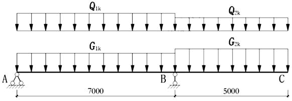 某钢筋混凝土楼面等截面梁,设计使用年限50年,安全等级为二级,不考虑地震,计算简图如下图所示。假设AB和BC上作用的永久
