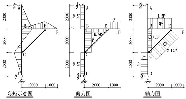 单选题 某管道支架的结构简图如图所示,安全等级为二级,其中构件AD为钢筋混凝土等截面构件,混凝土强度等级为C30(fc=14.3N/mm2),纵向钢筋采用HRB500,箍筋采用HRB400,as=a′s=50mm。杆BF和杆CE为钢结构构件,在F点作用竖向集中荷载设计值P,内力设计值见相关内力图。假定,不考虑地震设计工况,忽略构件自重。不考虑二阶效应,不考虑截面腹部钢筋的作用,钢构件的承载力及变形均满足设计要求。