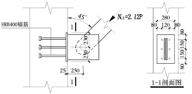 25(按3层2列布置),锚筋与锚板穿孔塞焊,节点承载力由锚筋控制。试问,满足该节点承载力要求的最大集中荷载设计值P(kN)与下列何项数值最为接近?( )