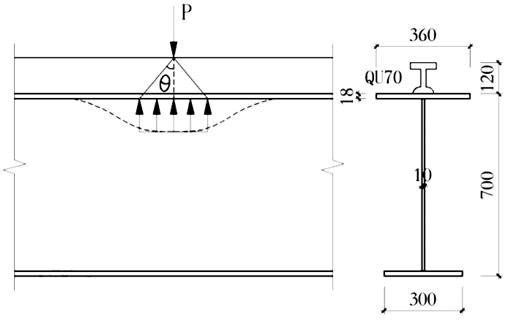 如图所示,轻级工作制钢吊车梁,钢轨采用QU70,惯性矩Ir=1.082×10^7mm4,钢轨高度为120m,直接通过钢梁上翼缘和钢轨刚度计算腹板等效承压长度。试问,轮压在轨道和吊车梁上1132的等效扩散角,与下列何项最为接近?( )