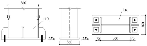假定该厂房采用外露式柱脚,柱脚形式如图所示,柱焊接截面H560×280×10×14,荷载效应基本组合下柱内力N=756kN,M=384kN·m,V=97kN。柱脚混凝土强度等级C40。试问,柱底板与基础间竖向压应力过柱翼缘中心,锚栓强度等级及直径为下列何项?( )
