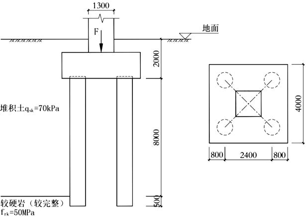 假定,桩身混凝土强度等级C40(fc=19.1N/mm2),通长配纵筋1412,螺旋箍筋均匀配置,间距150mm,成桩工艺系数0.9,桩嵌岩段侧阻与端阻综合系数0.7,试问:按《建筑桩基技术规范》(JGJ 94—2008)估算,原桩基础对应于荷载标准组合下,作用于承台顶面中心竖向力FK允许增加的最大值,与下列何项最为接近?( )