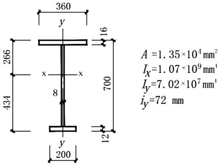 假定,简支吊车梁截面如图所示,截面无削弱,仅考虑吊车作用,吊车梁腹板计算高度上边缘局部压应力设计值为67MPa,吊车梁在轮压处的最大弯矩设计值Mx=663kN·m,My=0剪力设计值V=184kN。试问,进行腹板计算高度上边缘强度验算时,该处最大折算应力与容许折算应力的比例与下列何项数值最为接近?( )