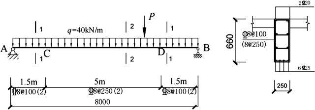 不定项选择题 某普通钢筋混凝土简支梁,设计工作年限50年,安全等级二级,混凝土采用C30,钢筋HRB400,as=70mm,as′=50mm,计算简图和配筋如图所示,同时承受均布恒荷载q和可在AB间自由移动的集中活荷载P的作用。梁底钢筋通长且在支座可靠锚固,相应于荷载基本组合,均布恒载设计值q=40kN/m。