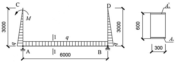 不定项选择题 某普通钢筋混凝土结构,安全等级二级,计算简图及构件截图等如图所示,杆件AB为等截面构件。假定,图中荷载同时作用于结构上,钢筋均为HRB400,混凝土采用C30,as=as′=40mm,构件自重忽略不计,不考虑地震设计状况。