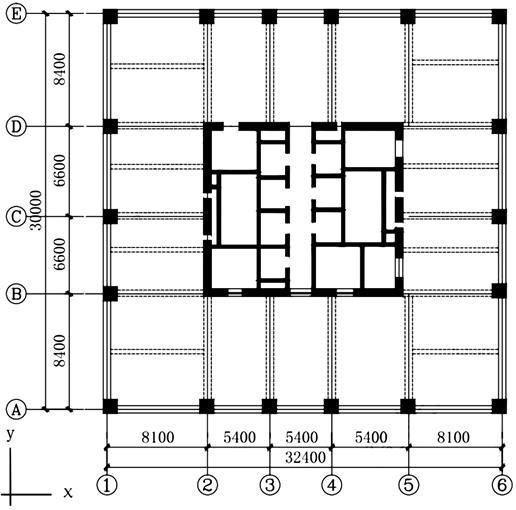 不定项选择题 某38层现浇框架-核心筒高层办公楼,标准设防类,安全等级一级,如图所示。内筒为钢筋混凝土筒体,外框柱采用型钢混凝土柱,楼面梁为钢筋混凝土梁,房屋高