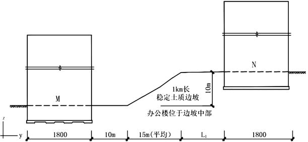 不定项选择题 某8层钢筋混凝土装配式办公建筑,抗震设防烈度8度(0.20g),丙类建筑,场地类别Ⅲ类,设计地震分组为第一组,采用框架-剪力墙结构,平面长度50m,平面宽度18m,房屋高度35m,平面、竖向规则,质量沿竖向分布均匀,一层地下室,地下室顶板座位上部结构嵌固部位,基础采用刚性相对较差的独立基础加防水板方案,设计时不计入地基与结构动力相互作用影响,x向平动第1自振周期为0.70s,y向平动第1自振周期为0.72s。设计完成后,由于规划调整,该建筑由M处移至N处,如图所示。假定,移址后场地变为抗震不利地段,除地震动参数应考虑边坡的影响外,其他设计条件均未变化,考虑到施工准备情况及工期因素,现拟将基础改为刚性较好的筏基,以计入地基与结构动力相互作用影响,使y向水平地震作用与移址前相等。试按《建筑抗震设计规范》(GB 50011—2010)(2016年版)有关规定估算,结构边缘距边坡坡顶边缘的最小距离L取下列何项数值时,可使多遇水平地震标准值作用下,移址前后结构y向水平弹性层间位移不增大?( )