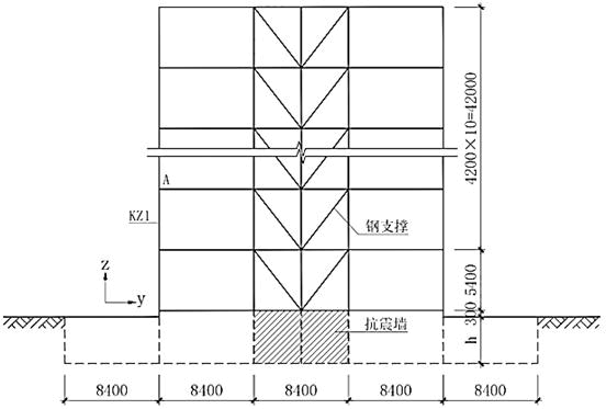 某高层钢筋混凝土办公建筑,抗震设防烈度7度(0.15g),标准设防类,Ⅲ类场地,设计地震分组为第二组,结构平面尺寸60m×25.2m,建筑平面双向设置一定数量的钢支撑,形成钢支撑-钢筋混凝土框架结构,典型剖面如图所示,房屋高度47.7m,平面、竖向规则,质量沿竖向分布均匀,设置一层地下室,地下室顶板可作为上结构的嵌固部位。
